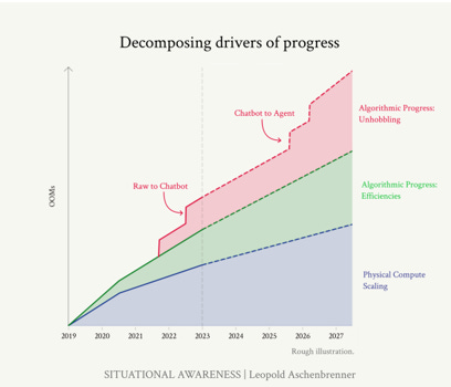 The key to understanding AI progress is recognizing that it is exponential, and hence measured in orders of magnitude (OOMs). One OOM represents a 10x improvement, two OOMs represent a 100x improvement, and so on. According to Ashenbrenner, AI development is driven by three cumulative factors: scaling of physical compute, algorithmic progress through efficiencies, and algorithmic progress through unhobbling.