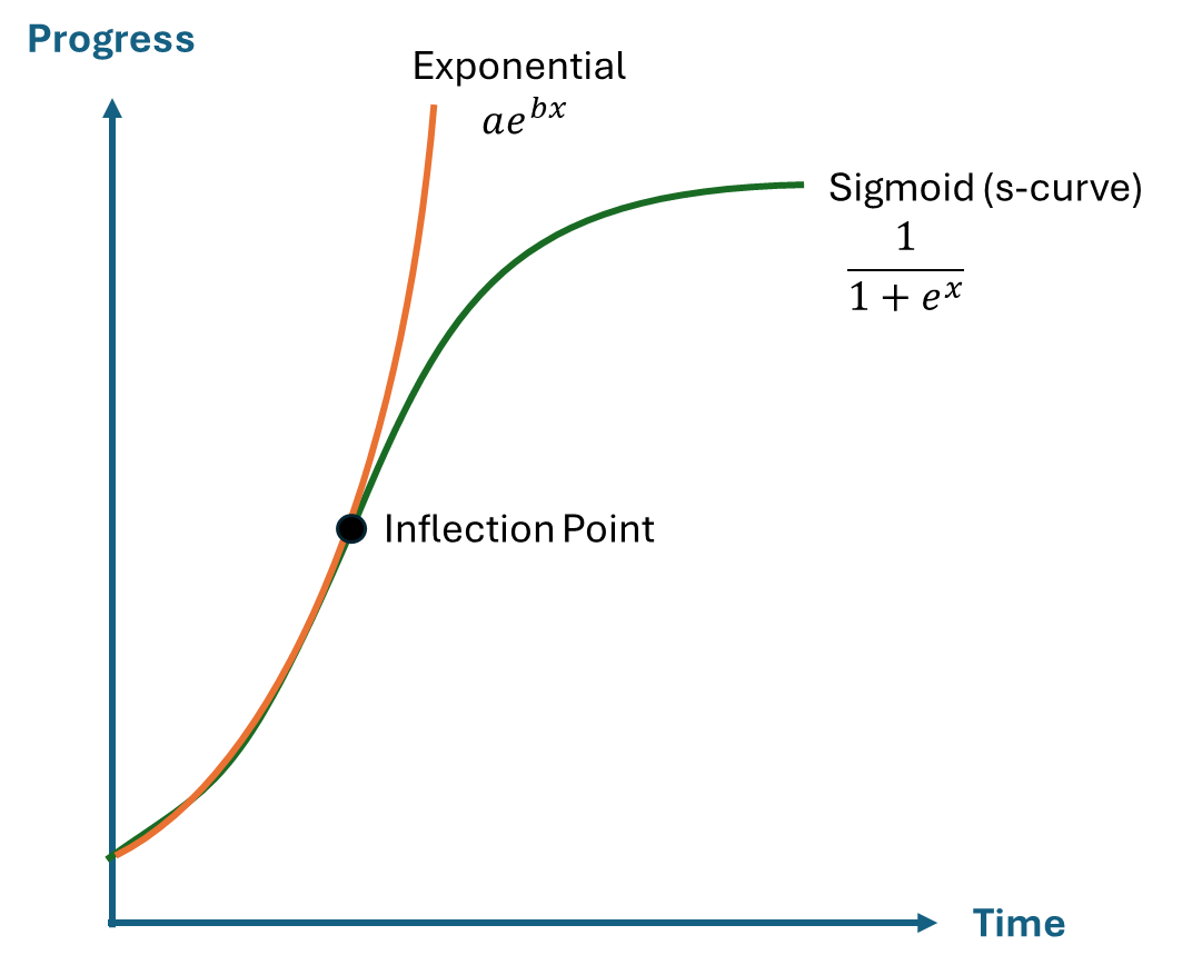 The problem with exponential growth is that it cannot continue indefinitely. For instance, if a computer's size doubled annually, by year 90, it would surpass the size of the known universe. Eventually, exponential growth tends to transition into s-curves. The key question is when this transition will occur.