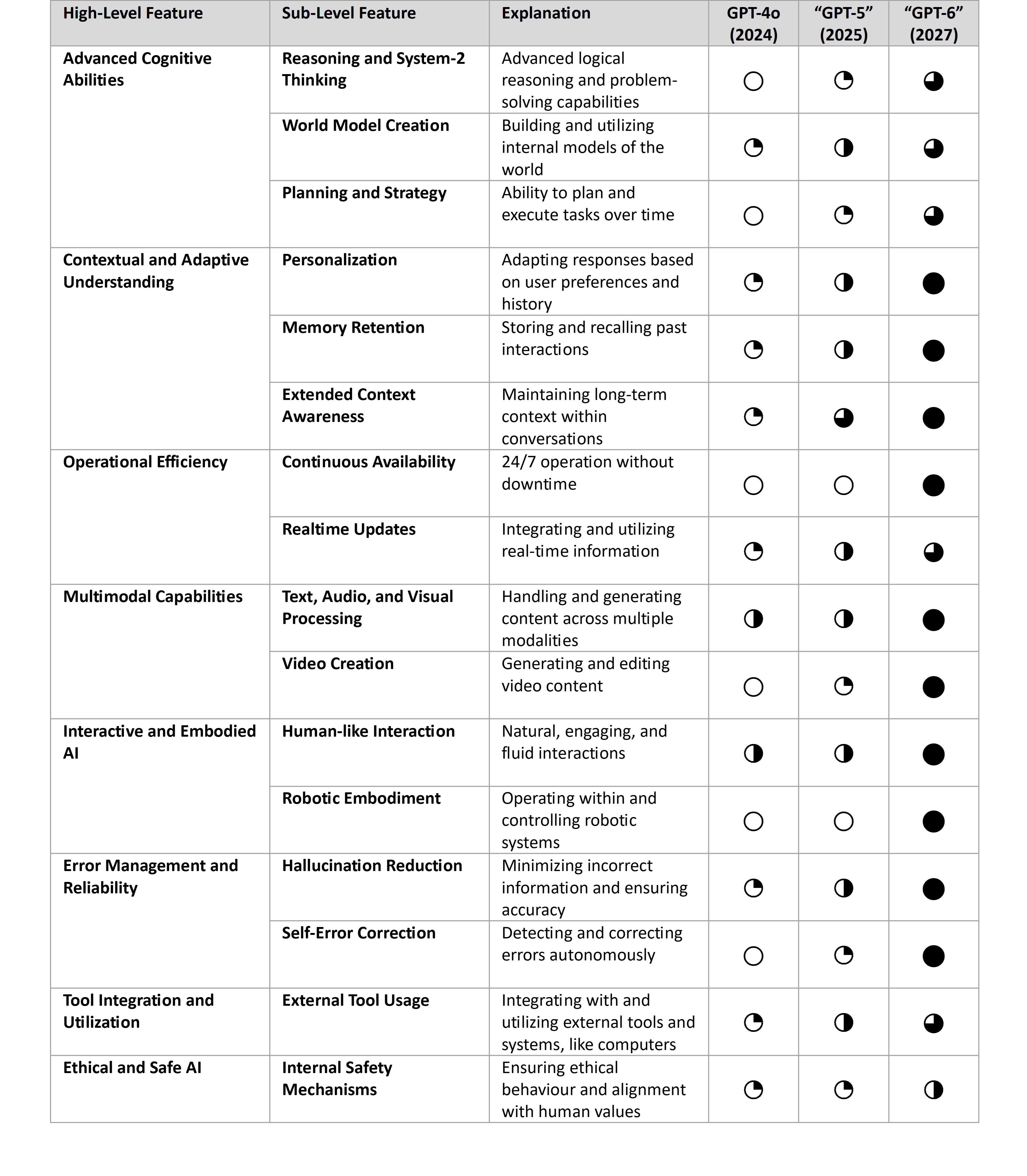 To understand where we are today and what we might expect in the next three years, I have compiled my current estimates in areas where models today are weak or lack capabilities. Note that my conviction level for these estimates is low, and I anticipate frequent and significant revisions. It's also possible that OpenAI could be surpassed during this period by Google DeepMind, Anthropic, or, less likely, a challenger such as Meta, Nvidia, or Elon Musk’s xAI.
