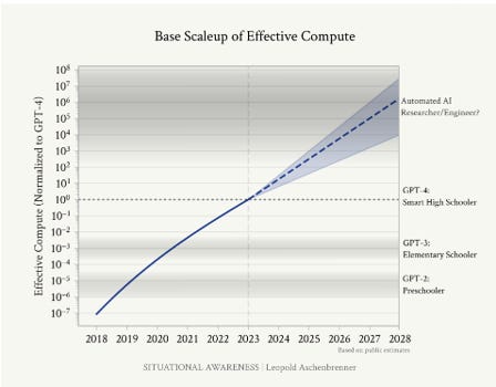 Leopold Ashenbrenner is a hyperintelligent AI researcher who graduated as the top student from Columbia University at the age of 19, three years ago. Apparently a loose cannon, his dismissal from OpenAI’s long-term safety team, the so-called super-alignment team, was unsurprising. I mention him because he has recently been an insider at the leading AI lab. By turning down a $1 million equity deal, he is also free to discuss his experience. He has done so through a well-written 165-page report on AI development. While there are a lot to disagree about in it, I believe he has effectively captured the underlying mechanisms of AI progress.